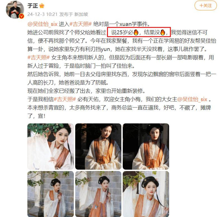 于正在拍摄《吉天照》的时候,曾发文表示吴佳怡曾有大火的机会,但《吉天照》上映后,吴佳怡并没有获得过高的关注,当吴佳怡还没火的时候,于正又喊话另一位女演员必火,因为长得太美了,各位读者,你们知道这位女演员是谁吗?