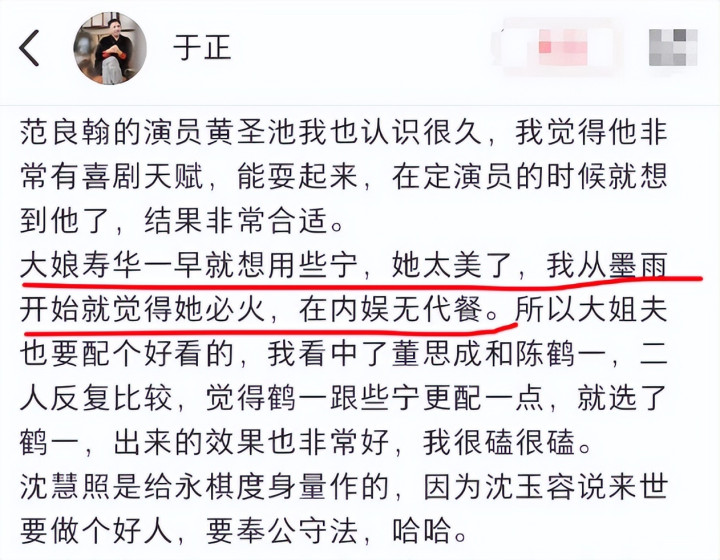 近日,“于正说刘些宁必火”话题突然登上热搜,点开话题后,我们可以发现于正说:大娘寿华一早就想用刘些宁,她太美了,我从《墨雨云间》开始就觉得她必火,在内娱无代餐。